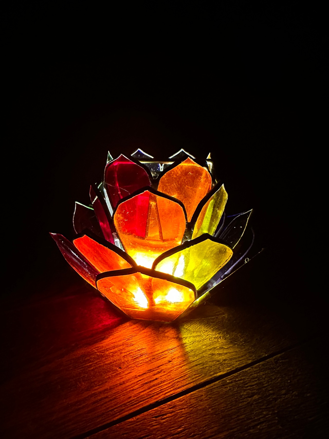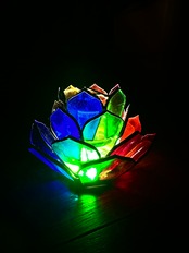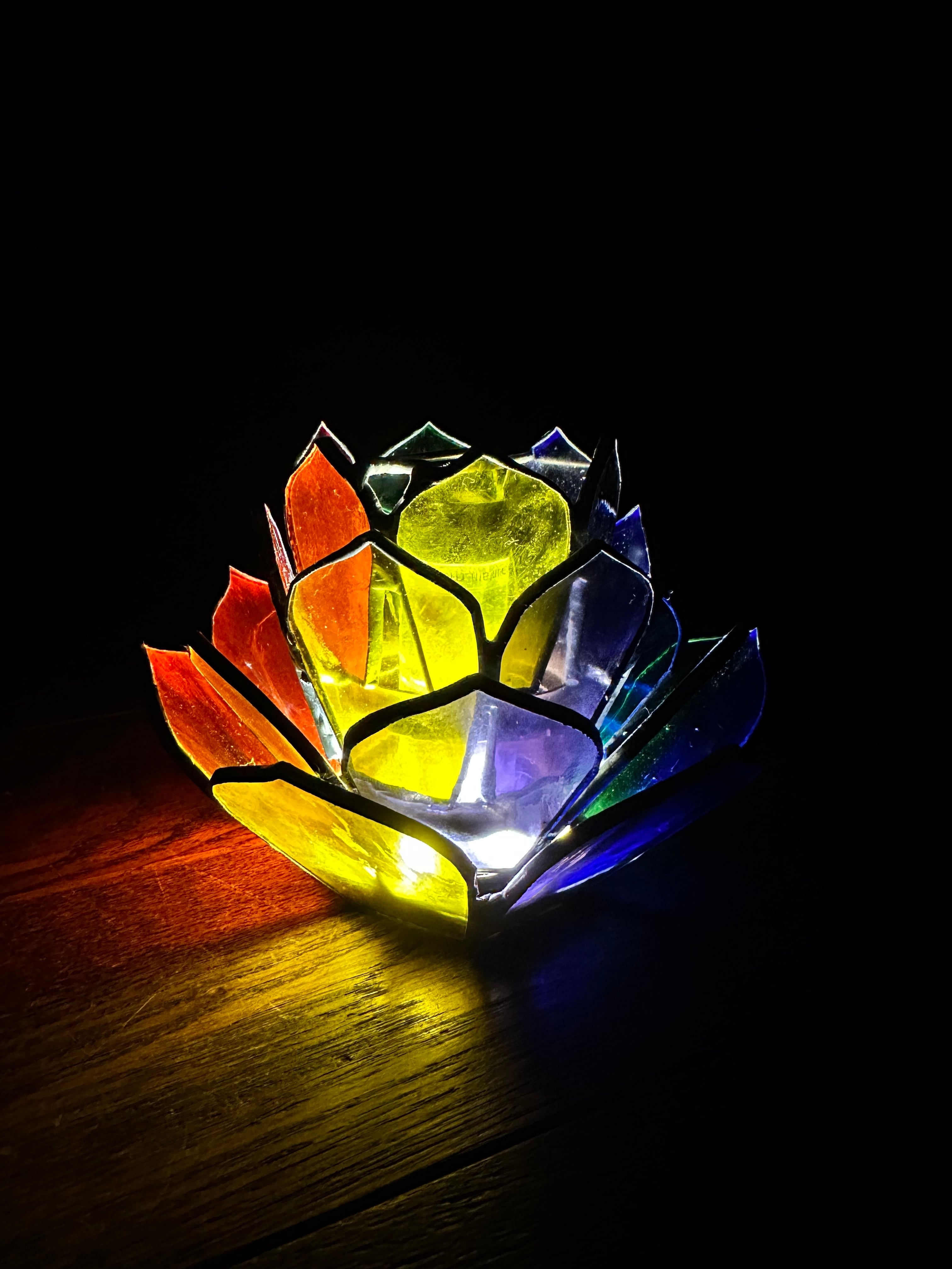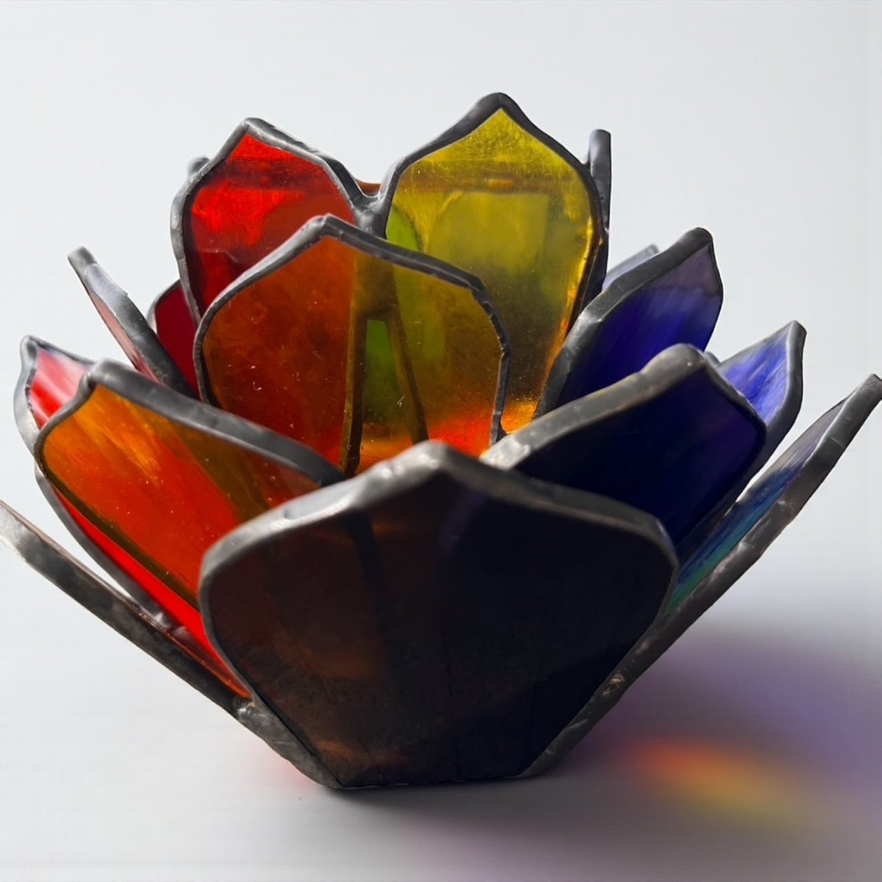 美しいアメリカ製ウォーターステンドグラスで仕上げたハンドメイド作品、AGAVE guradeshon。AGAVEの葉をイメージしてデザインされたこの作品は、ステンドグラス職人が一つひとつ丁寧に葉の形にカットし、切り口を銅で加工することで、立体感溢れる仕上がりになっています。6色のステンドグラスに光を受けた時の美しい反射が、空間を一層魅力的に演出します。
